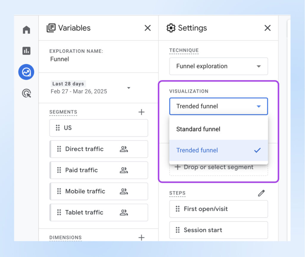 GA4 ofrece dos visualizaciones poderosas de embudos.