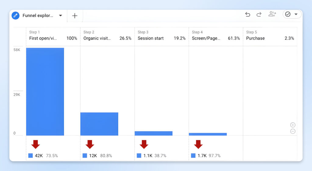 La exploración de embudos en GA4 visualiza cómo los usuarios progresan a través de tus caminos de conversión e identifica exactamente dónde abandonan.