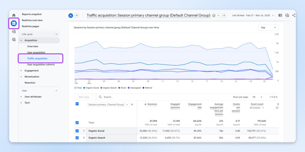 Ve a Informes > Adquisición > Adquisición de tráfico.