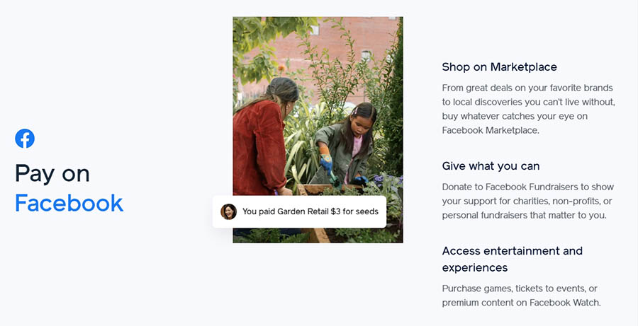 Si usas Instagram y Facebook Shopping, puede que tengas acceso a Facebook Pay. Esta es la pasarela de pago interna de Meta que está disponible en países selectos. En este caso, tus clientes pueden usar Facebook Pay para hacer pagos desde Facebook, Instagram, WhatsApp y Facebook Messenger:
