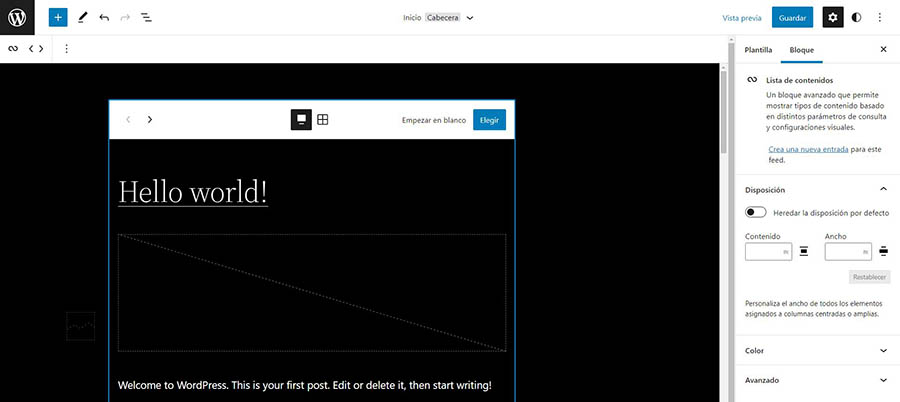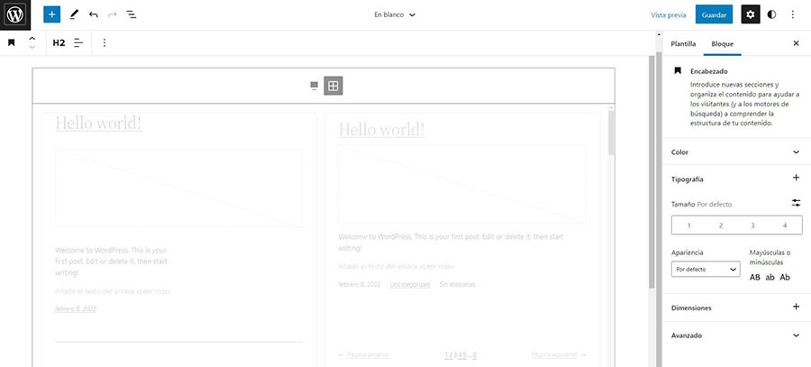 El Full-Site Editor viene con plantillas para diferentes páginas, tales como tu página inicial o la de archivo. Adicionalmente, puedes personalizar más áreas de tu sitio, tales como tu encabezado y pie de página. También hay una nueva función de Estilos Globales, la cual te permite definir configuraciones de sitio completo para tus bloques.