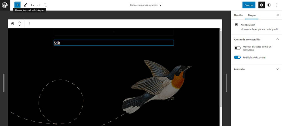 Este bloque proporciona una manera simple de añadir un botón de inicio o cierre de sesión a tu sitio web.