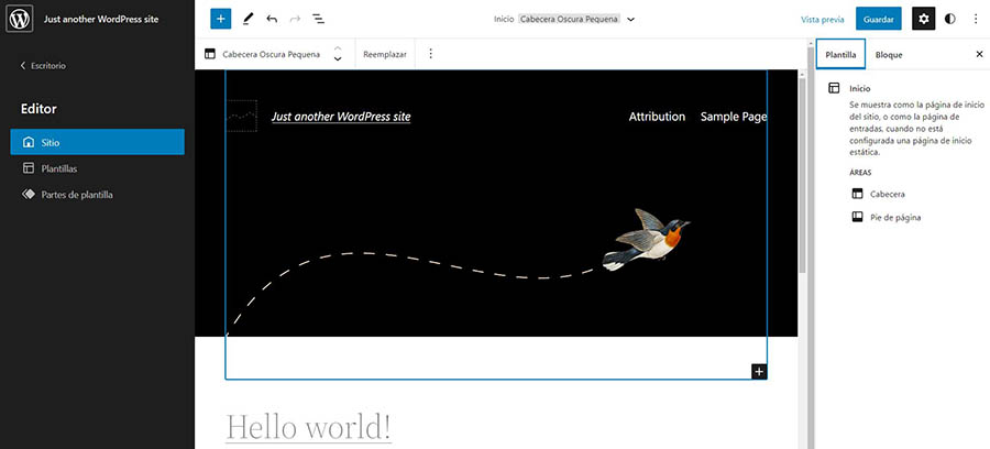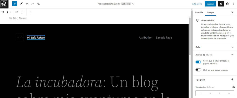 Gracias a la funcionalidad Full-Site Editing, ahora puedes hacer cambios a tu sitio completo desde una interfaz unificada. También puedes personalizar elementos individuales tales como el título del sitio y logotipo, menú de navegación y partes de plantilla, tales como los encabezados y el pie de página.