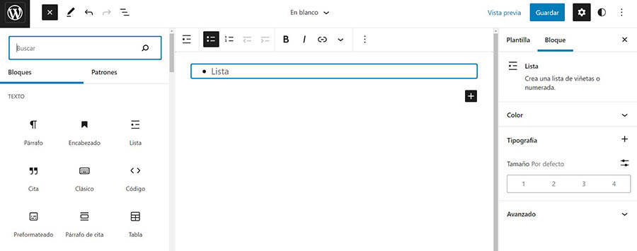 El bloque de Lista te permite insertar listas enumeradas o con viñetas en tu página.