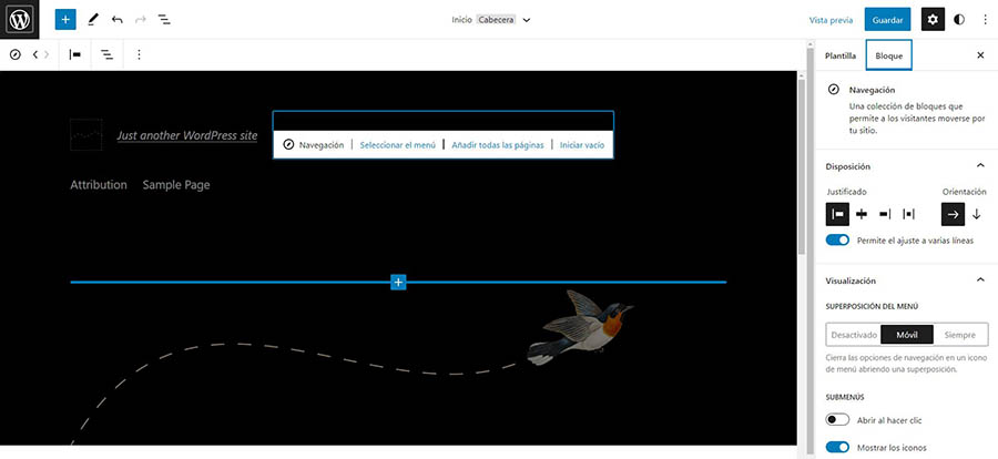 Los bloques de navegación son empleados para los menús de tu sitio. Cuando añades este bloque a tu página, se te proporcionan 3 opciones: Seleccionar un menú existente, añadir todas las páginas del sitio o comenzar con un menú vacío.
