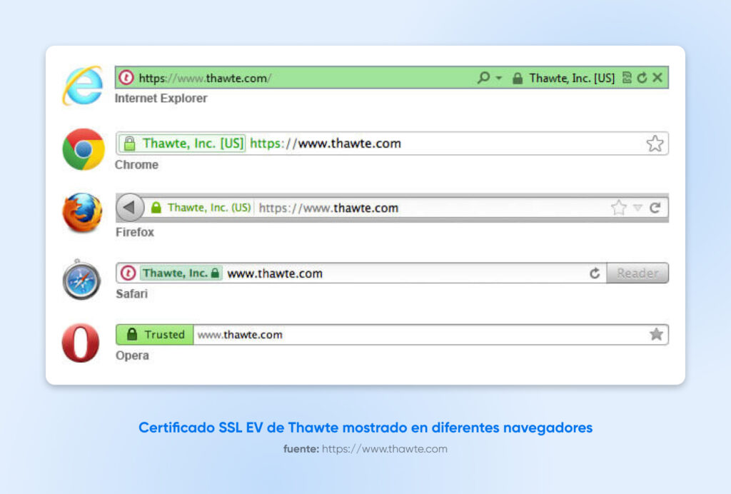 Fuente – Certificado SSL EV de Thawte mostrado en diferentes navegadores