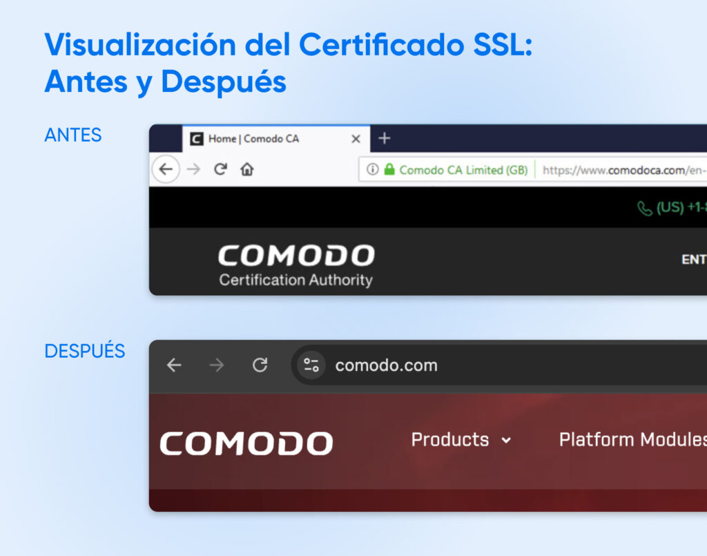 El resultado final era que el nombre de tu empresa se mostraba en el navegador, como en este ejemplo de Comodo (uno de los principales proveedores de certificados SSL).