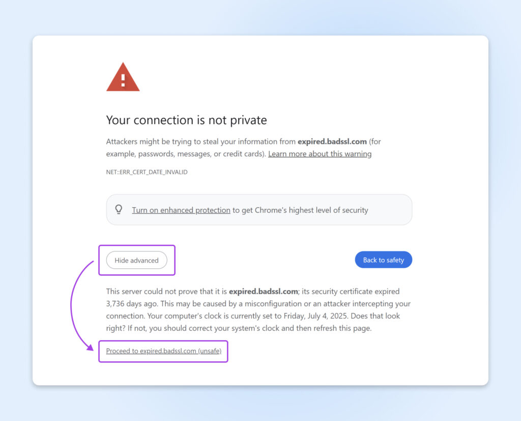 Los usuarios debían hacer clic en “Avanzado” y luego en “Acceder al sitio de todas formas (no seguro)” antes de poder ver la página.
