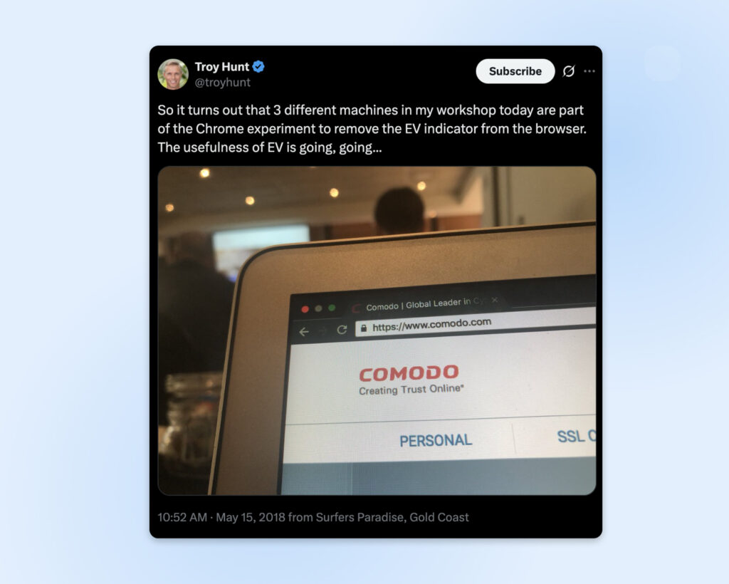 Troy Hunt, el creador de Have I Been Pwned, compartió un tweet cuando Chrome comenzó a experimentar con la eliminación del indicador EV en el navegador durante la primera mitad de 2018.