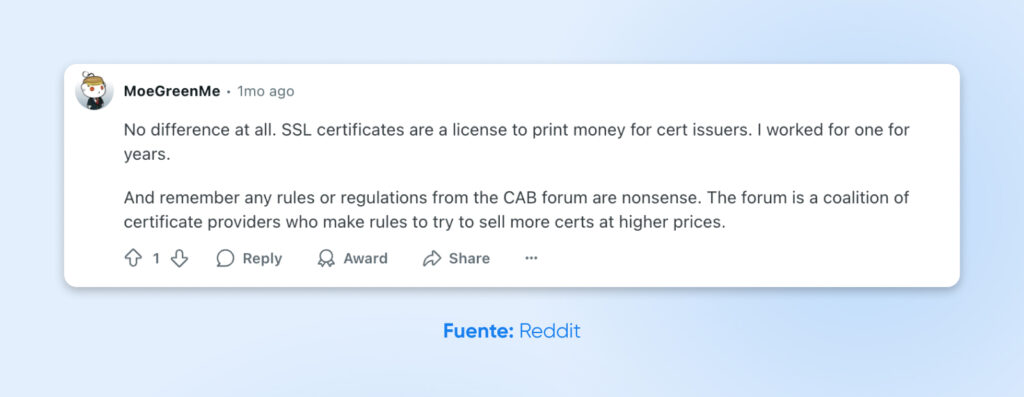 Un usuario de Reddit que afirmó haber trabajado para una autoridad certificadora respondió a la pregunta: “¿Cuál es el propósito de los certificados SSL de alta gama?”