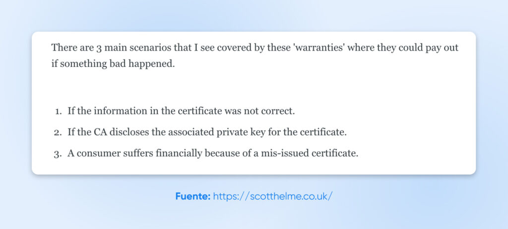 Los certificados EV vienen con garantías, normalmente entre $10,000 y $2 millones, según el tipo de certificado. Estas garantías supuestamente te protegen si la autoridad certificadora comete errores que provocan brechas de seguridad.