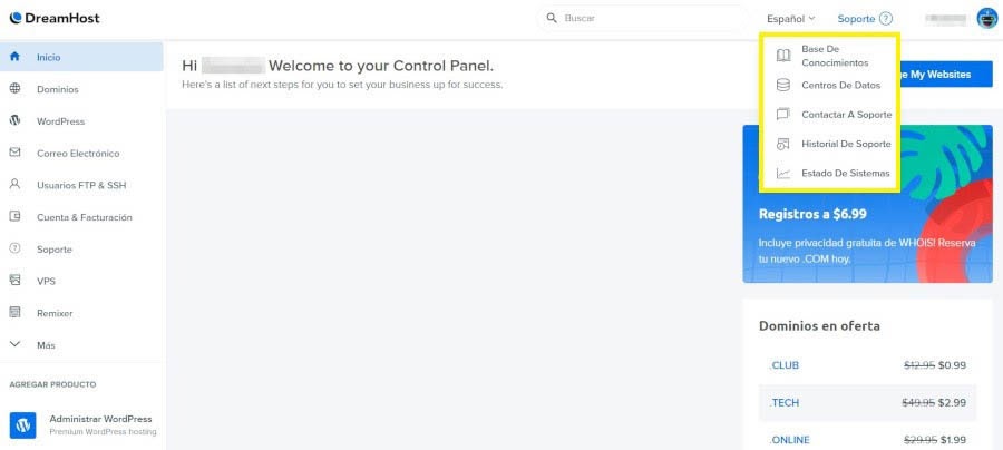 En DreamHost, siempre puedes encontrar opciones de soporte al hacer clic en el botón Soporte en la esquina derecha superior de tu panel de control: