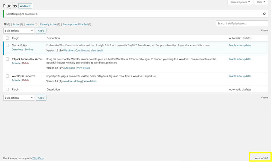 Primero, descarga la versión de WordPress que tu sitio está usando. Puedes encontrar el número de la versión actual al seleccionar la esquina inferior derecha de cualquier página en tu panel de WordPress.
