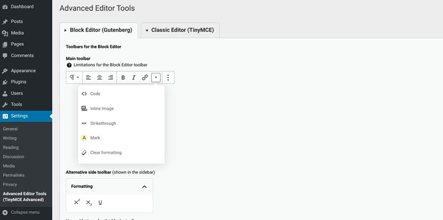 Después de que lo instalas y activas, puedes ubicar la configuración navegando a Settings > Advanced Editor Tools.