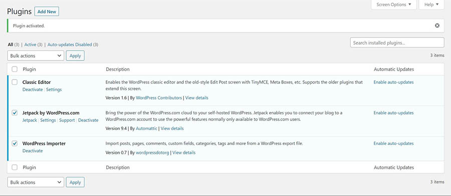 Si desactivar tus plugins resuelve el error, tu siguiente paso es aislar el plugin que lo estaba causando. Puedes revisar la lista uno por uno y hacer clic en el botón Activate bajo el nombre del plugin. Después de que cada uno esté reactivado, revisa para ver si el error ha aparecido de nuevo. De lo contrario, puedes continuar hasta encontrar el plugin problemático.