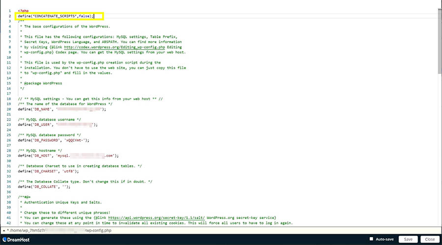 Si las soluciones de arriba no han funcionado, puedes intentar modificar tu archivo wp-config.php para forzar a WordPress a cargar los scripts individualmente. Para hacerlo, comienza por abrir tu sitio WordPress en el administrador de archivos de DreamHost o a través de SFTP, como mencionamos anteriormente.