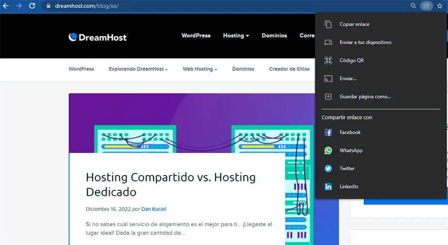 Para generar un código QR en Chrome, visita la página que quieras compartir y fíjate en la barra de navegación. A la derecha verás un ícono con una flecha. Si haces clic en él, el navegador te mostrará las opciones que tienes para compartir la página: