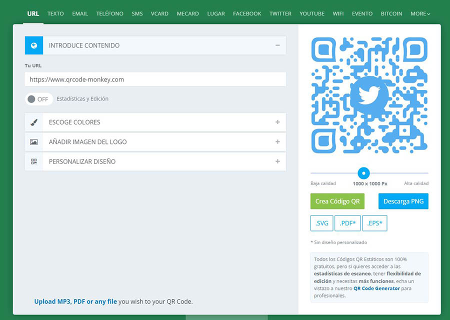 QR Code Monkey ofrece una alternativa más versátil a las dos herramientas anteriores que hemos mostrado. Este servicio te permite generar códigos QR estáticos configurables gratuitamente.