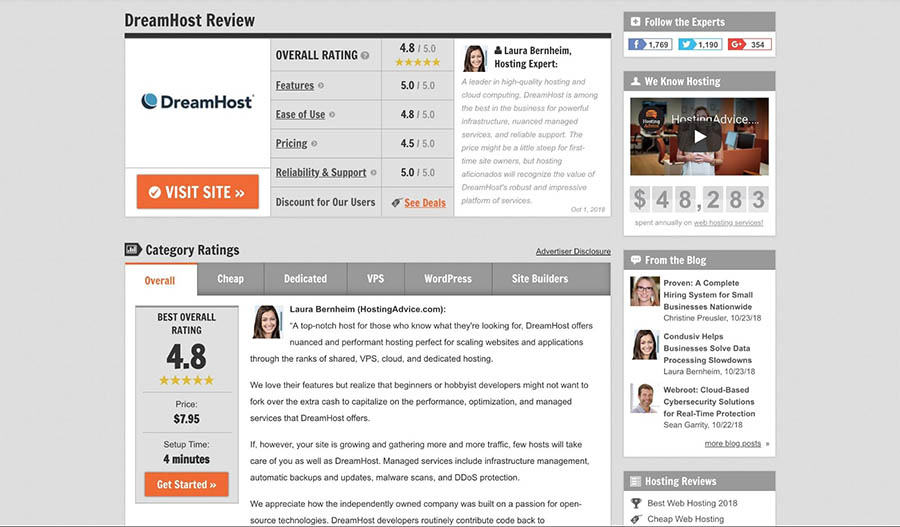 Sin embargo, también podrías ir por lo grande y crear un sitio más estructuralmente complejo con un sistema avanzado de puntaje, reseñas múltiples por producto y más. Por ejemplo, HostingAdvice ofrece puntajes granulares para precisión añadida.