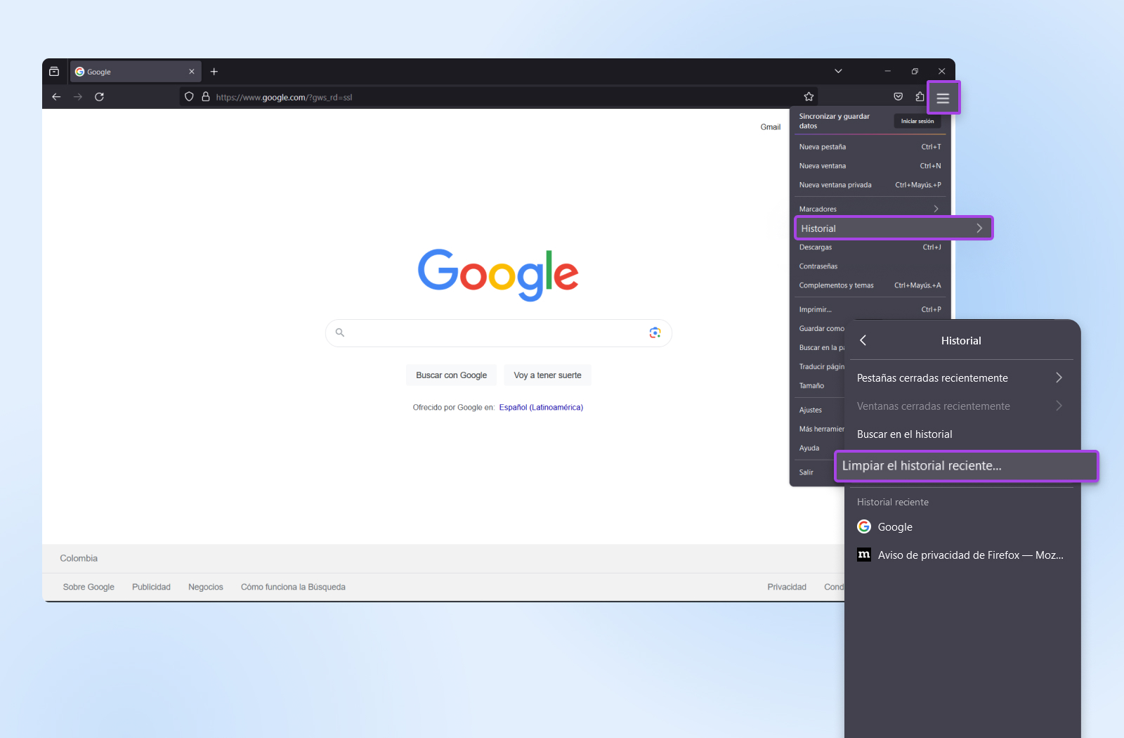 Si usas Mozilla, accede al menú de hamburguesa (tres barras horizontales) en la parte superior derecha. Ve a ‘Historial > Borrar historial reciente’.