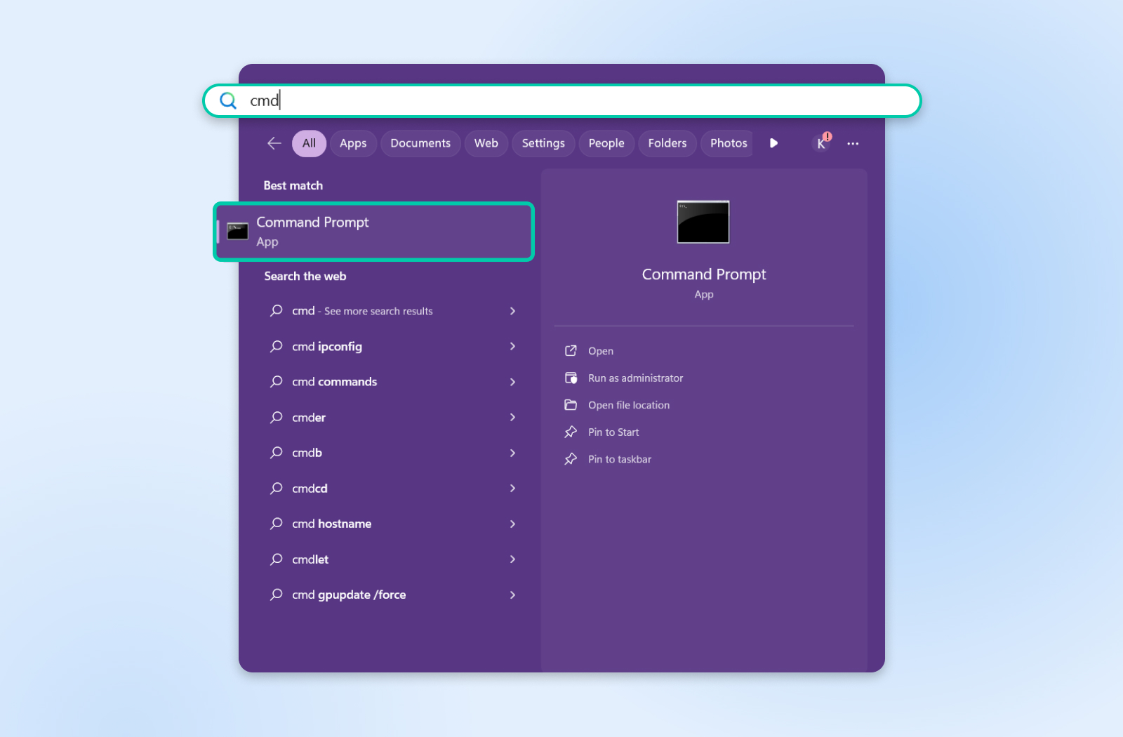 Si estás usando Windows, puedes vaciar el caché de DNS utilizando el Símbolo del sistema. Para acceder a él, escribe “CMD” en la búsqueda de Windows en la barra de tareas y presiona Enter.