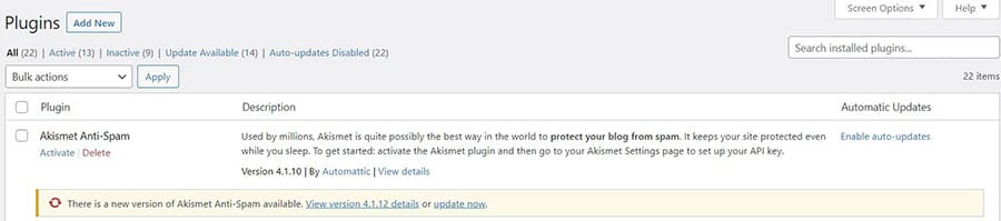 Los plugins desactualizados deben tener un mensaje diciéndote que hay una nueva versión disponible. Puedes elegir actualizarlos todos manualmente o habilitar las actualizaciones automáticas.