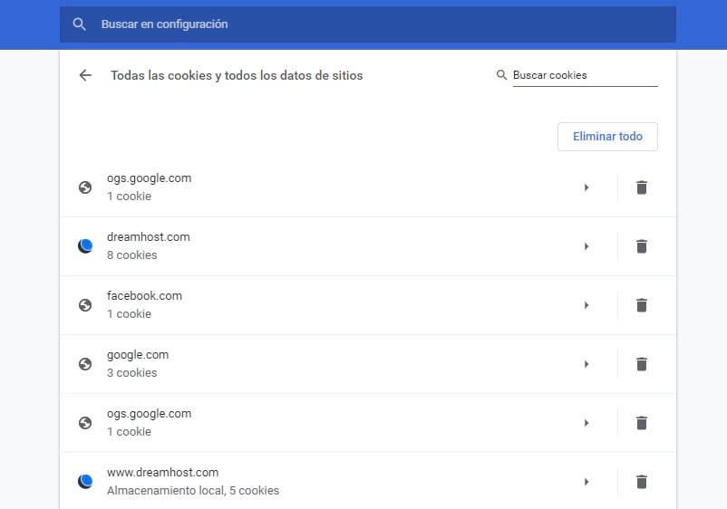 Esto abrirá una lista de todas las cookies que diferentes sitios tienen con tu información. busca tu sitio y usa el ícono de “papelera” a continuación para eliminar la información que está almacenando.
