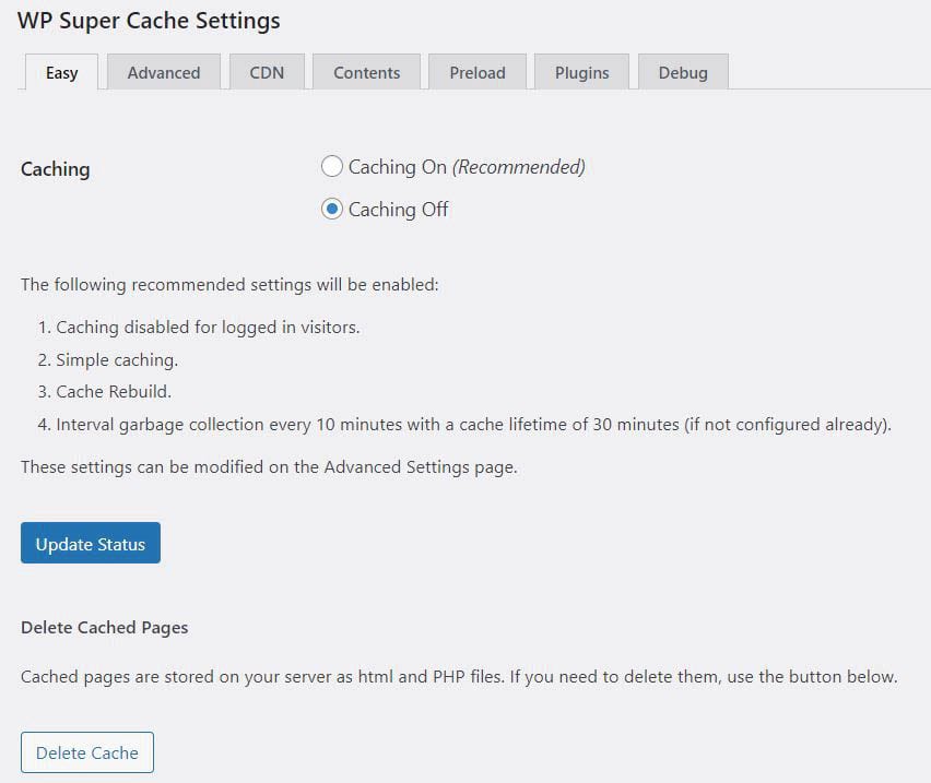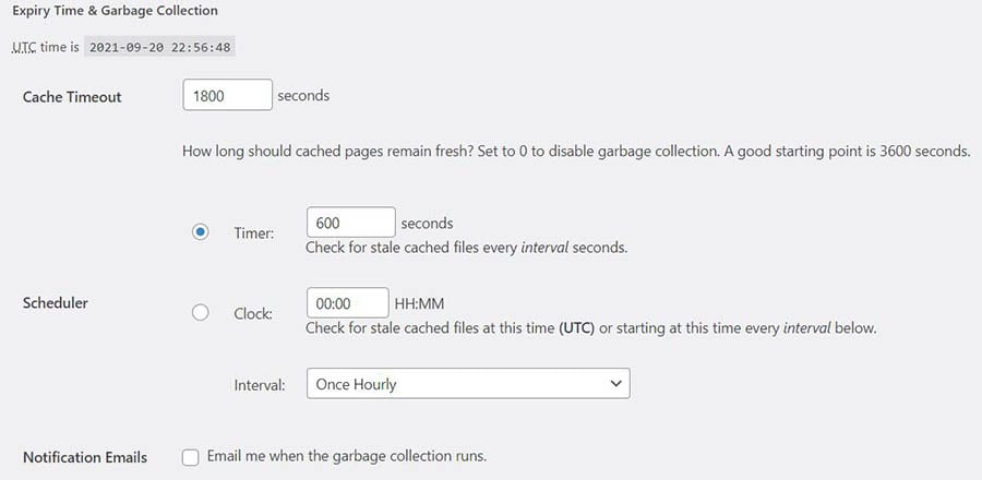 Un add-on tal como WP Super Cache te permite remover los archivos cacheados manualmente, o seleccionar un tiempo personalizado e intervalo, para escanear tu sitio en búsqueda de archivos de caché desactualizados. Incluso, puedes elegir recibir emails cuando el proceso suceda.