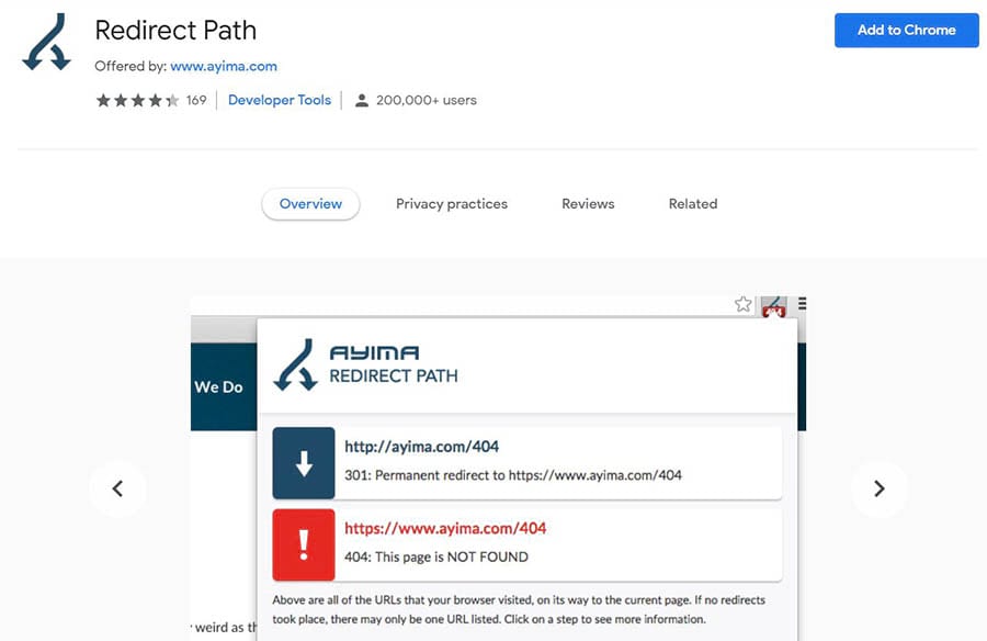 Alternativamente, algunos servicios adicionales de navegador pueden mostrarte la naturaleza de las redirecciones en diferentes sitios. Por ejemplo, la extensión de Chrome Redirect Path marca los mensajes de error de redirección en tiempo real.