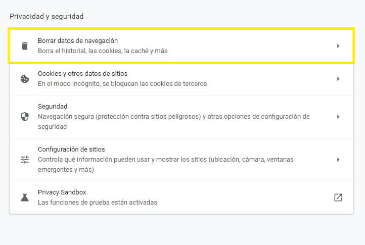 Si estás trabajando en Chrome, puedes dirigirte a la sección ‘Configuración’ y desplazarte hasta ‘Privacidad y seguridad’. Aquí, haz clic en ‘Borrar Datos de Navegación’.