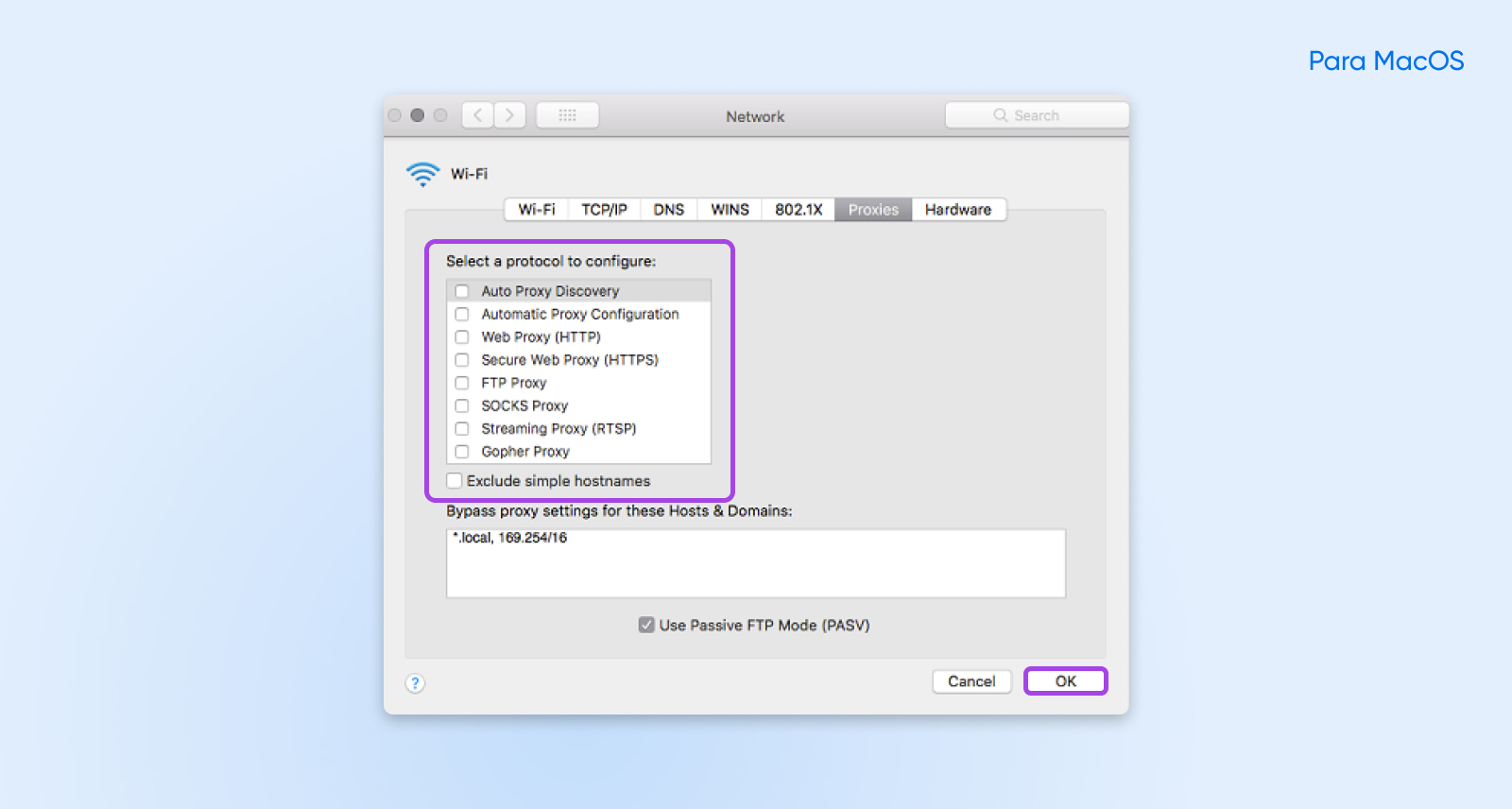 Para MacOS: Abre ‘Preferencias de sistema’, ve a ‘Red’, y haz clic en ‘Avanzado’. Bajo la pestaña ‘Proxys’, desmarca todas las casillas y haz clic en ‘OK’.