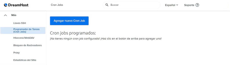 Comienza en el panel de DreamHost. Inicia sesión en tu cuenta de alojamiento, luego ve a Más > Cron Jobs. Haz clic en el botón Agregar un nuevo Cron Job.