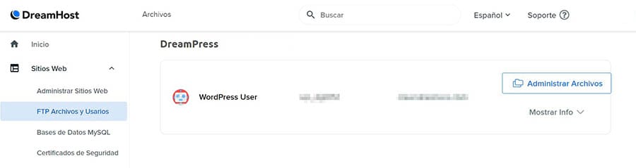 Si tienes una cuenta de DreamHost, comienza por navegar a Sitios Web > Archivos y Usuarios en la barra lateral. A continuación, ubica tu dominio y haz clic en el botón Administrar Archivos.