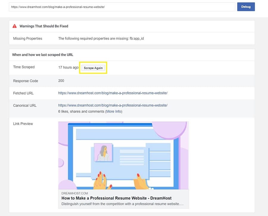 Hacer clic en él causará que la plataforma revise de nuevo tu publicación y verá la imagen miniatura actualizada. Recuerda que puede que tengas que hacer esto 2 veces para solucionar por completo el error de miniatura incorrecta de Facebook.