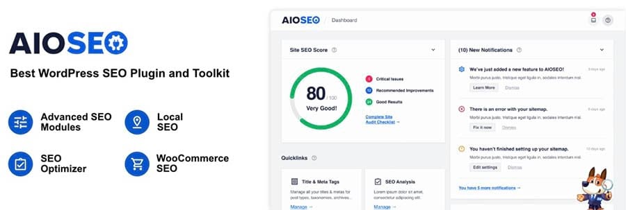 Si Yoast SEO no ha resuelto el problema (o prefieres un plugin de SEO diferente), puedes también intentar AIOSEO. Es una plataforma poderosa que puede ayudarte a solucionar el error de miniaturas incorrectas y escalar a la cima de los resultados de búsqueda.