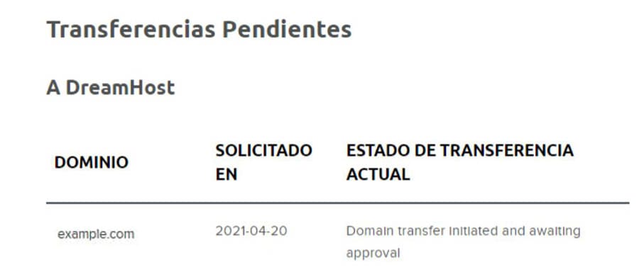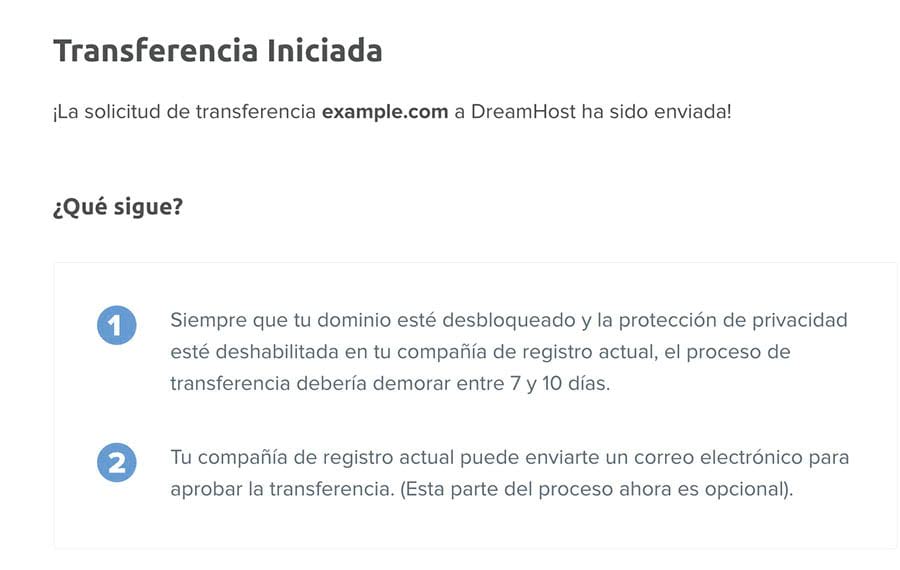 La compañía entonces tiene 5 días para liberar el dominio a DreamHost y la transferencia se completará en los siguientes 7 días.