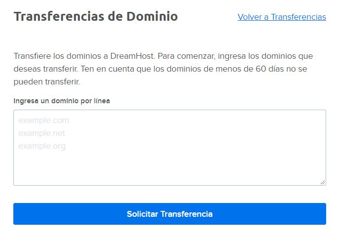 En esta sección, todo lo que necesitas hacer es añadir el o los dominios que deseas transferir a DreamHost y hacer clic en Solicitar Transferencia.