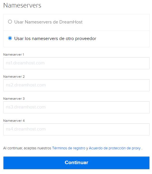 Selecciona Usar nameservers de DreamHost (esto automáticamente configura los nameservers de DreamHost por ti) o Usar los nameservers de otro proveedor (deberías escoger esta opción si quieres ingresar tus nameservers manualmente).