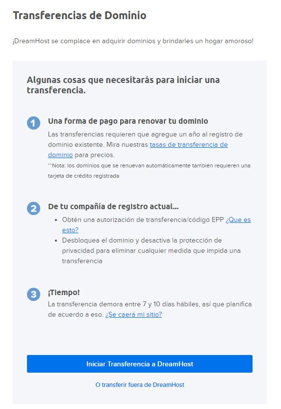 Y recuerda que, transferir un registro de dominio solo mueve tu dominio. Si quieres transferir tu servicio de alojamiento web a DreamHost, también podemos ayudar.