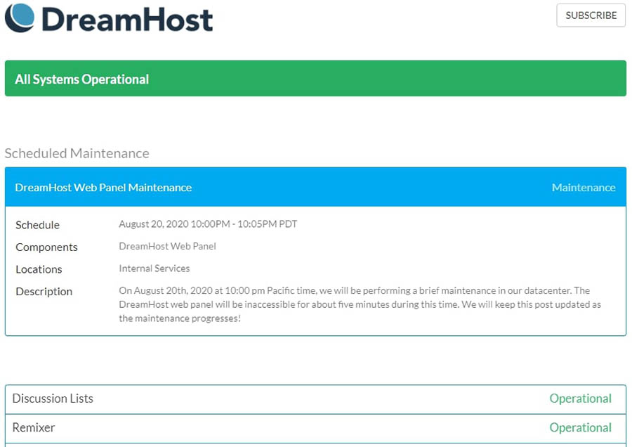Una vez que has eliminado otras posibilidades y determinado que tu sitio está fuera de línea, querrás saber si es solo tu sitio o si es un problema de alojamiento. Puedes ver la página de Status de DreamHost para enterarte si hay un problema con todo el sistema.