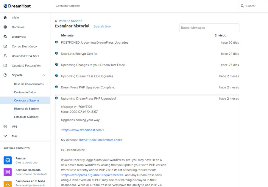 Luego de que Soporte resuelve tu problema, aún puedes referirte a la conversación si lo necesitas. Puedes encontrar los tiquetes cerrados en la sección de ‘Historial de Soporte’ en el panel. También encontrarás otros mensajes de DreamHost aquí.