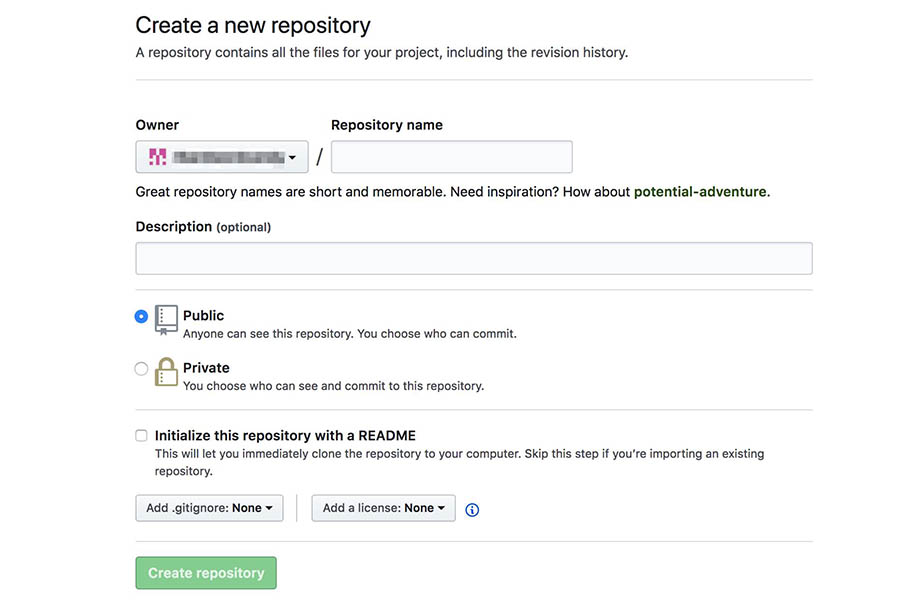 Ya que te inscribiste en una cuenta gratuita, sólo podrás crear un repositorio público (aunque es todo lo que necesitas por ahora). También tendrás la opción de clonar el repositorio inmediatamente a tu computador usando un archivo ‘README’. Puesto que tienes un repositorio local existente, no deberías seleccionar esta opción. Sin embargo, puede ser una herramienta útil para los proyectos futuros.
