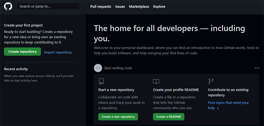 Luego serás llevado directamente a tu panel de GitHub. Si deseas saber más sobre los conceptos básicos de usar GitHub, recomendamos tomarte algo de tiempo para leer la guía mencionada anteriormente. Por ahora, sin embargo, vamos a crear un repositorio.