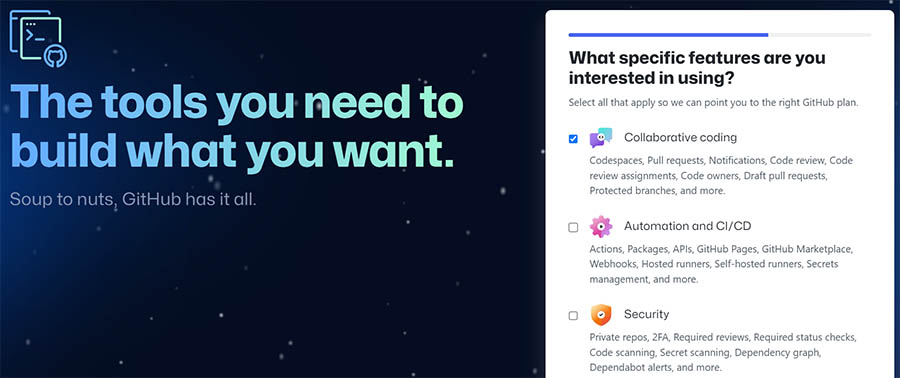 Después de eso, se te preguntará qué funciones estás intentando usar. Recomendamos seleccionar la opción ‘Collaborative coding’ como mínimo: