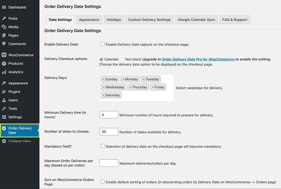 Una vez que instales y actives este plugin, navega a Order Delivery Date en tu panel de WordPress.