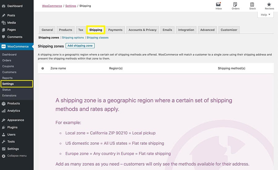 En tu panel de WordPress, navega a WooCommerce > Settings > Shipping.