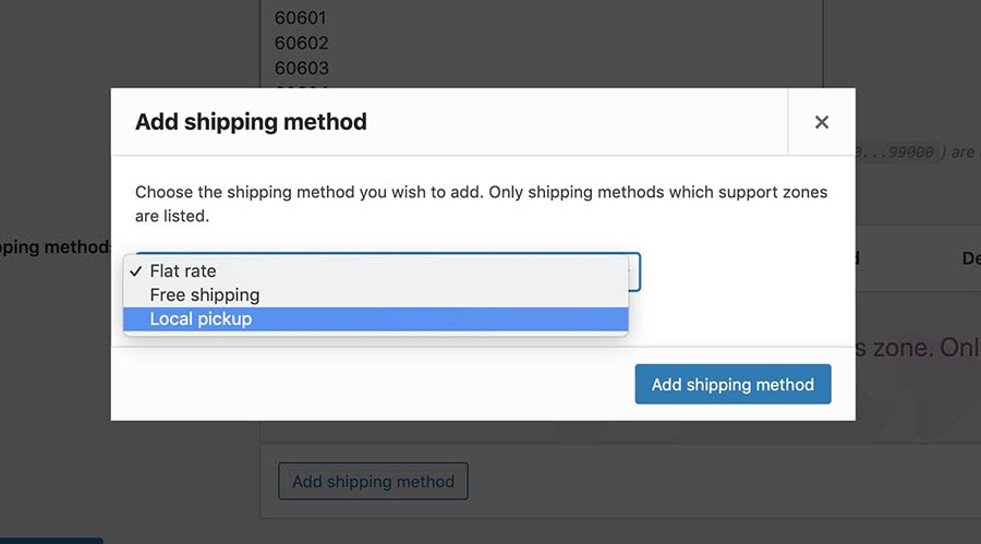 WooCommerce incluye una opción de recolección local fuera de la caja. Selecciona la opción del menú desplegable, luego haz clic en el botón Add shipping method.