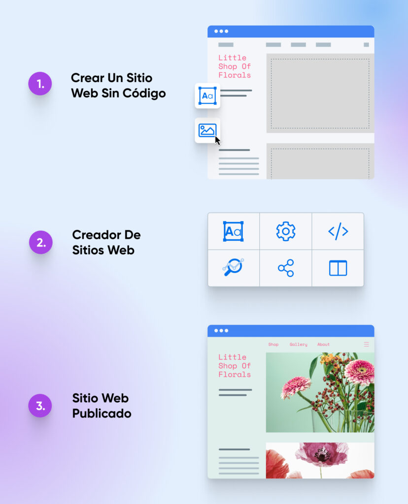 Explica cómo funciona un creador de sitios web con gráficos: 1) crear un sitio; 2) utilizar el creador de sitios web; 3) sitio publicado.