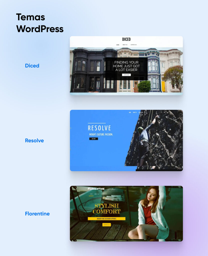 Las imágenes muestran vistas previas de tres temas de WordPress: Diced, Resolve y Florentine