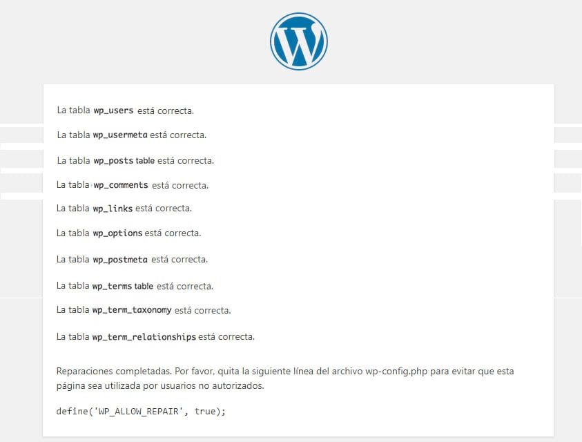 Haz clic en alguno y ejecuta la herramienta de reparación. Cuando termines, la página se recargará y verás un mensaje que dirá que las tablas de la base de datos ya se repararon.